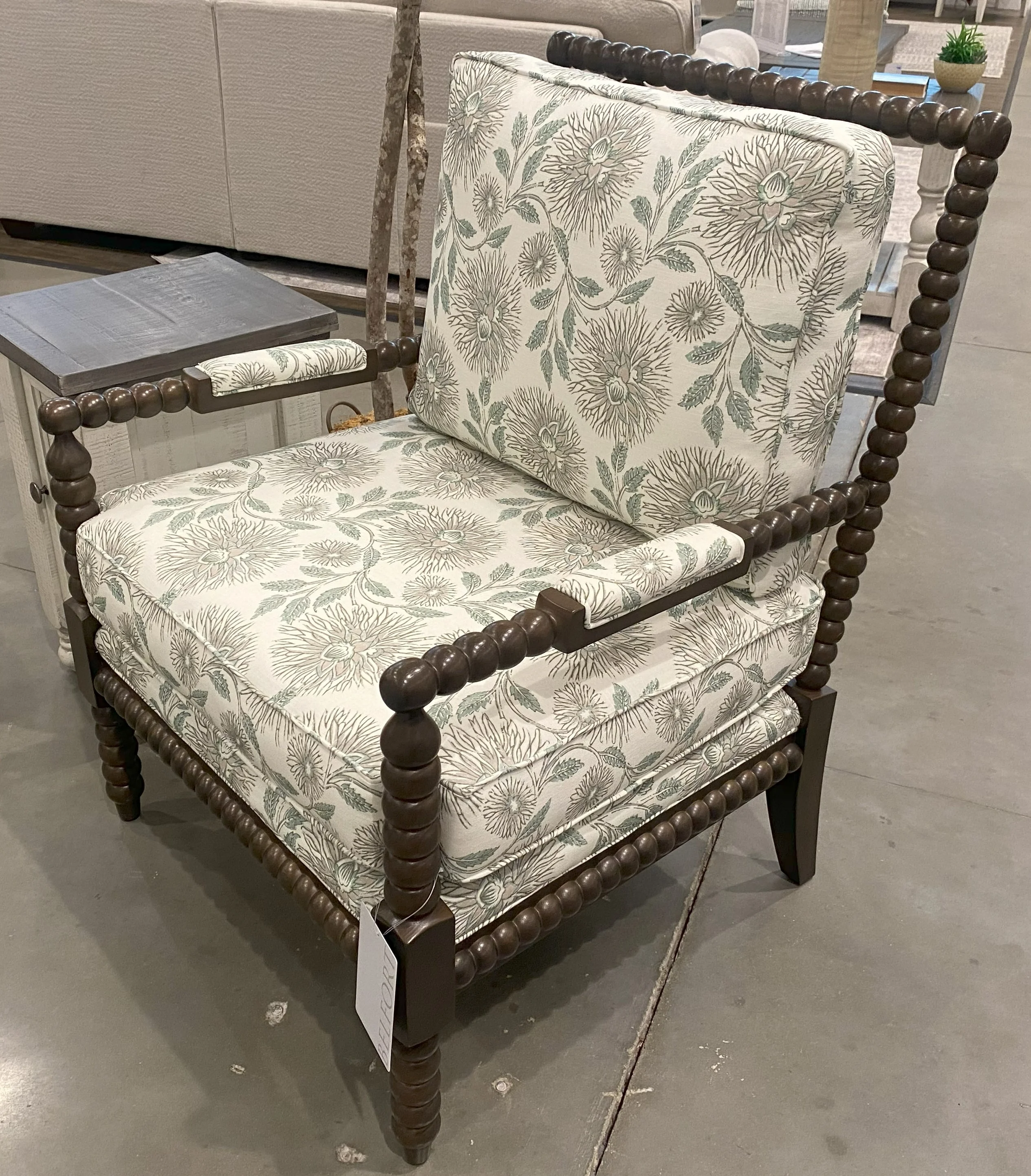 moreThis chair is a great accent piece for a cottage coastal, country farmhouse, or traditional style room. It boasts classic, spool-turned arms and posts for a quaint, traditional touch. The spool-turned back features open slats for a glimpse of your chosen chair fabric. Loose cushions are our Comfort Soft construction for years of plush support that won't sag.