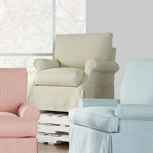 The Chairs and Accents Beatrix Casual Slip Cover Swivel Glider, made by Rowe,