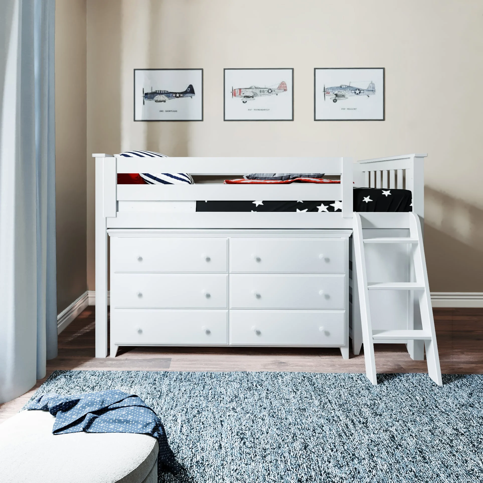 The Loft Bed collection features beds that are functional, playful, safe and built to last. With numerous storage combinations you can make the most of the space in children’s bedrooms. Slip resistant straight and angled ladders make climbing safe and fun. Loft beds with play curtains transform children’s bedrooms in to the perfect place to sleep and the perfect place to play. Choose from a variety of finish options, storage options and play curtain options to fit the style of your child’s bedroom.