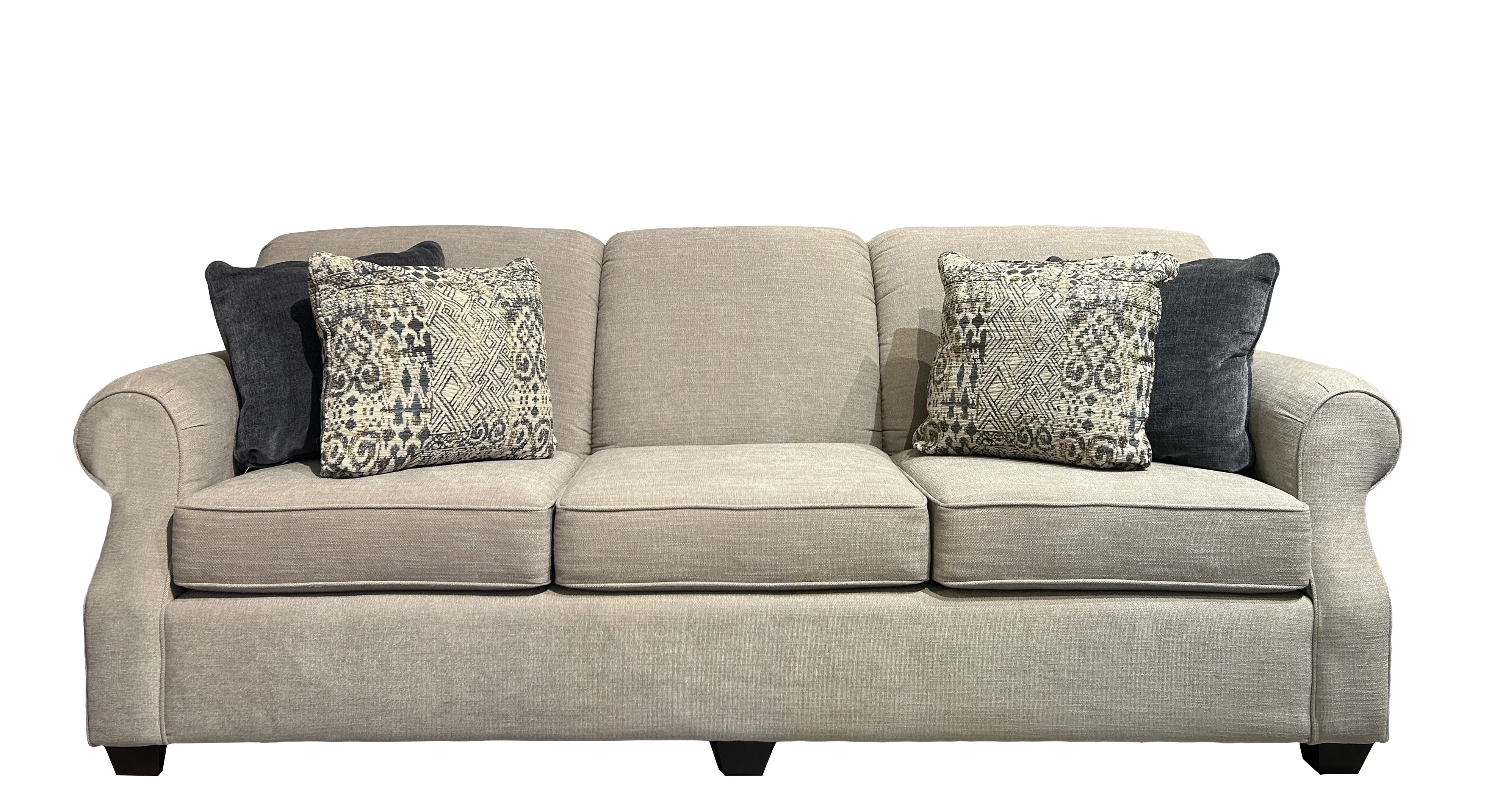 moreThis comfortable sofa makes a great focal point for your living room with a casual style that looks great from any angle. The rolled back detail on the cushioned back adds a sophisticated dimension to the style. Low profile rolled arms create a simple look with a down-home, cottage appeal. Welt cord trim and tapered wood feet add a finished look to this sofa. Complete your room with the loveseat (not shown), coordinating chair, and ottoman for a cozy seating group in your living room, family room, or den. Made in the USA using fine craftsmanship techniques, this sofa is available in a wide variety of fabric options by special order for a customized look that fits with your decor.
