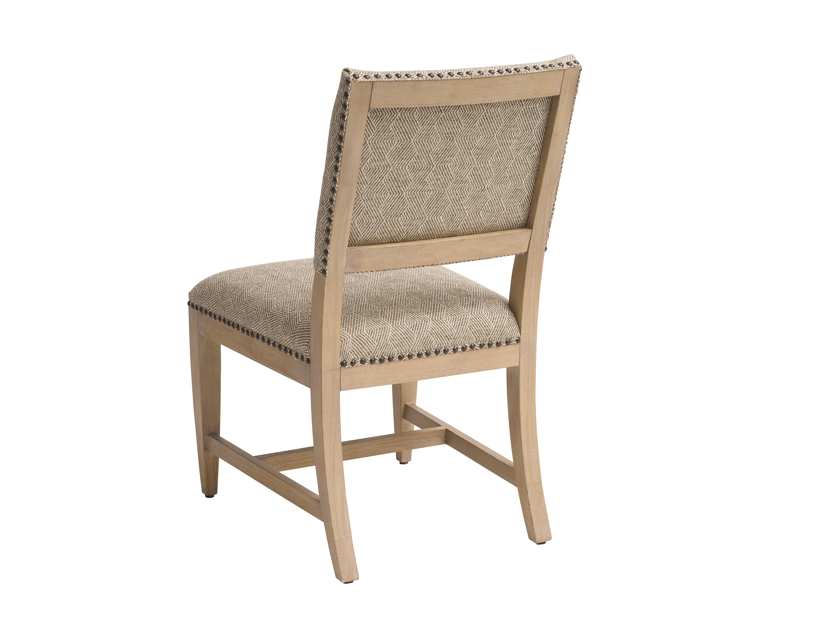 moreThe Colburn side chair features a fully upholstered seat and back. The standard fabric is 2200-11 Seabridge which is an indoor performance fabric in shades of ivory and camel. The nailhead trim around the on the seat and back is available as shown in an old gold finish which complements the light chestnut brown with ivory cerusing on the exposed wood.
