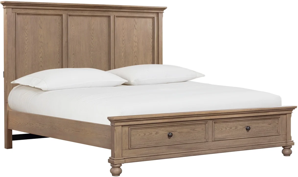 moreThis traditional queen storage bed is designed to provide a comfortable and convenient sleeping solution. The bed features a sturdy construction made from select hardwood solids, ensuring long-lasting strength and durability thanks to the dovetail joinery technique used in its case construction. The light wood tone and tan finish give the bed a warm and inviting appearance that fits well with traditional decor.
