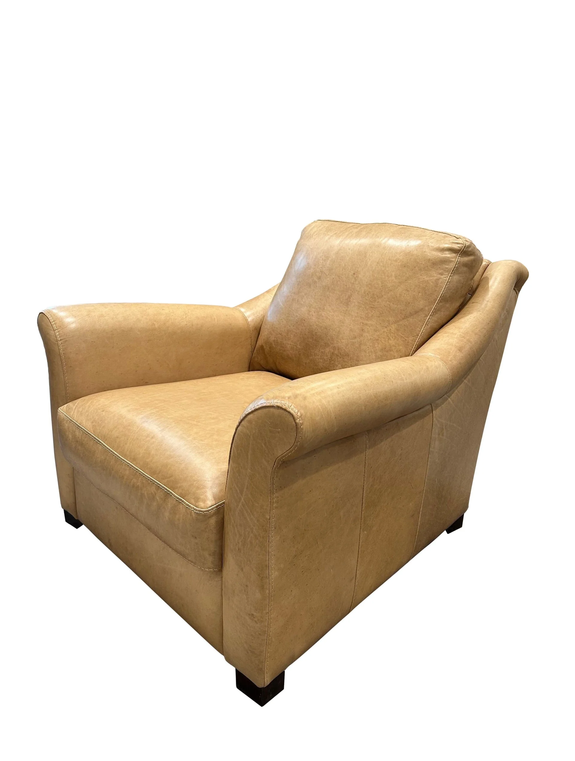 moreUpgrade your cozy living room with a stunning new leather accent chair. This leather chair has gorgeous flared rolled arms and very sophisticated shaping details. It is shown in a beautiful Dallas Saddle leather, a wonderful warm color that fits perfectly into any style or space.
