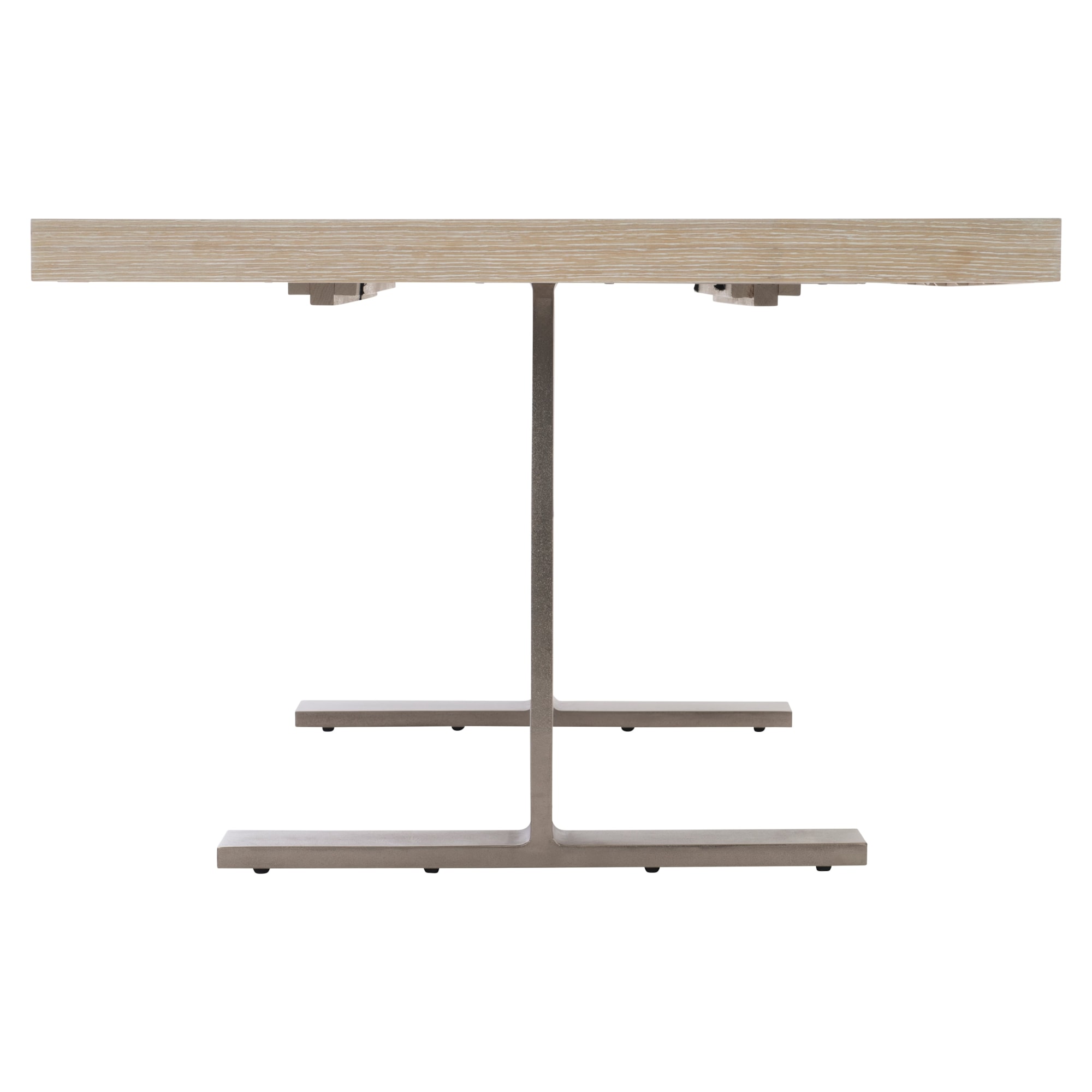 moreIn the Solaria dining table, cast steel legs in a simple T-shape support a clean-lined fancy face top featuring quartered white oak veneers in a Dune finish. The sleek form and elemental materials craft a modern industrial look with roots in Bauhaus forms. The rectangular table extends from 88 inches to 110 inches with the addition of a single leaf.