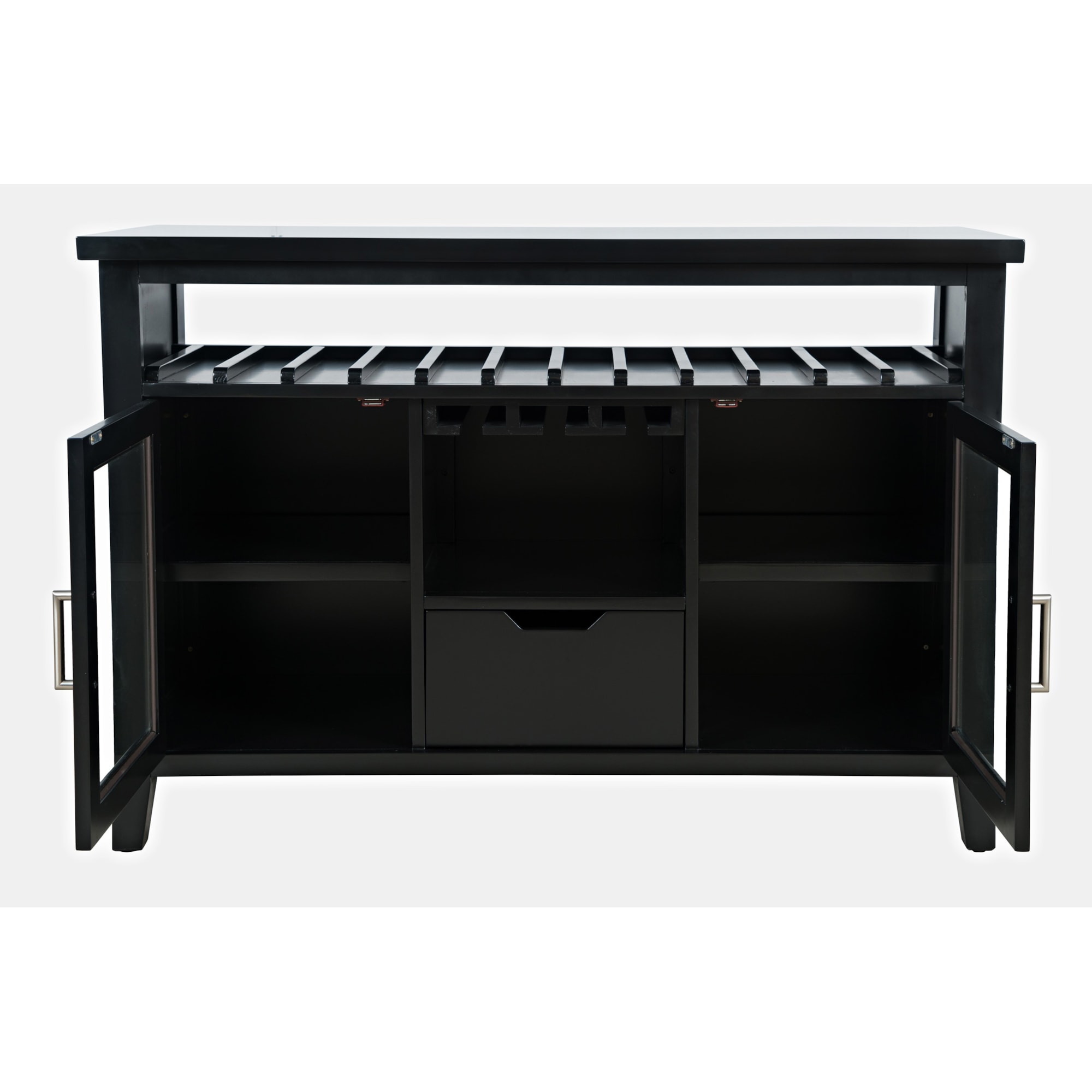 Additional features include wine bottle storage, wine glass storage, and concealed storage behind the glass doors. The server is also available in white and merlot finishes, allowing you to choose the perfect hue to match your unique style.